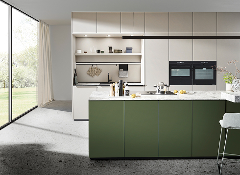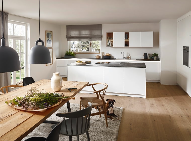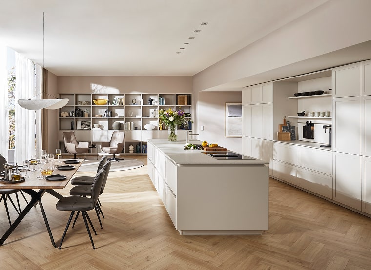 Terughoudend en onopvallend voegt alles zich samen tot een multifunctionele woonruimte. Design wordt hier een brug tussen eet-, woon- en keukenruimte en speelt naadloos in op actuele trends. Subtiele kleurtinten in schelpwit en zandgrijs satijnlak creëren een harmonieus en tegelijkertijd modern geheel.
