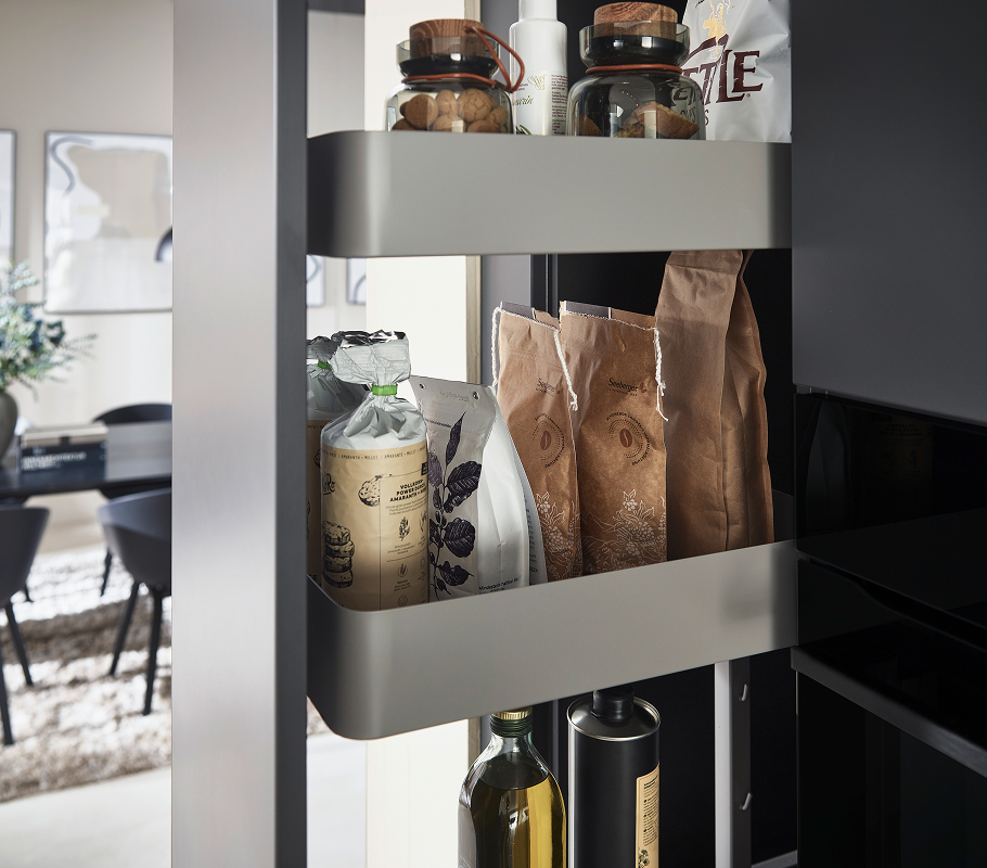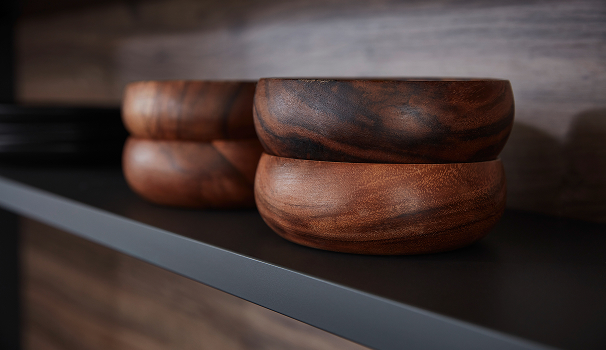 Goed doordacht – een minimalistische look en de modernste technologie, evenals open reksystemen en verschillende werkbladhoogtes, creëren een harmonieus en sfeervol ambiance.