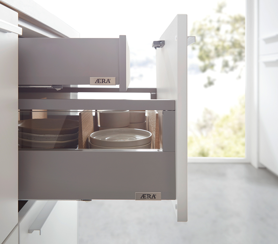 Het slanke design en de strakke lijnen maken duidelijk: Deze elegante keuken is zowel visueel als functioneel helemaal van deze tijd. Zo wordt bijvoorbeeld de keukenachterwand optimaal benut voor extra opbergruimte. In het wandpaneel vinden kookgerei betrouwbaar een plek, en de lades met volledige uittrek en glazen zijkanten zorgen voor overzichtelijke orde.