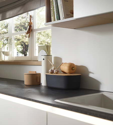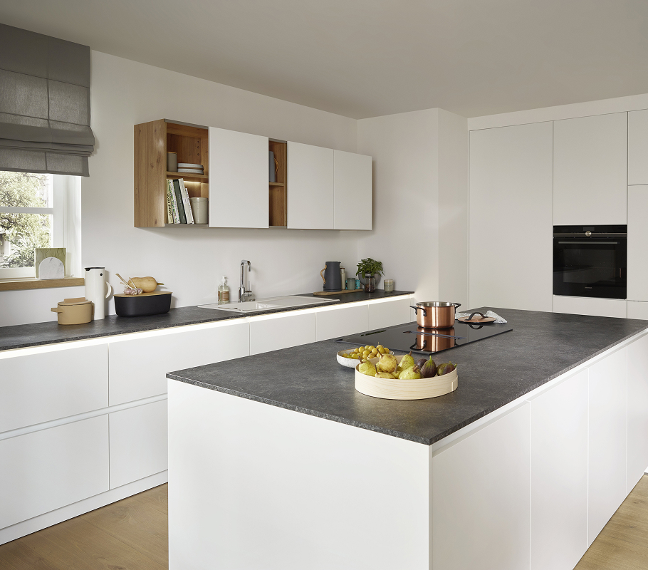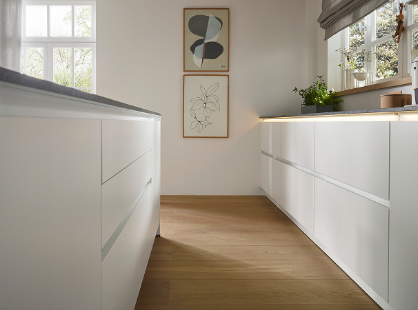 De strakke look van de minimalistische Nova in kristalwit wordt harmonieus afgerond door het gerichte gebruik van LED-lichtstrips. Bovenkasten, handgrepen en sokkels worden zo visueel benadrukt en stralen in gezellig licht. Achter kastdeuren met Tip-On mechanisme, in lades met volledig uittrekbare en in bovenkasten met schuifdeursysteem, wachten kookgerei en co. altijd klaar voor gebruik. De bijpassende bijkeuken is ook zo ontworpen. Hier zorgen hoge kasten met kledingstang en passende inzet voor het sorteren van was voor orde.